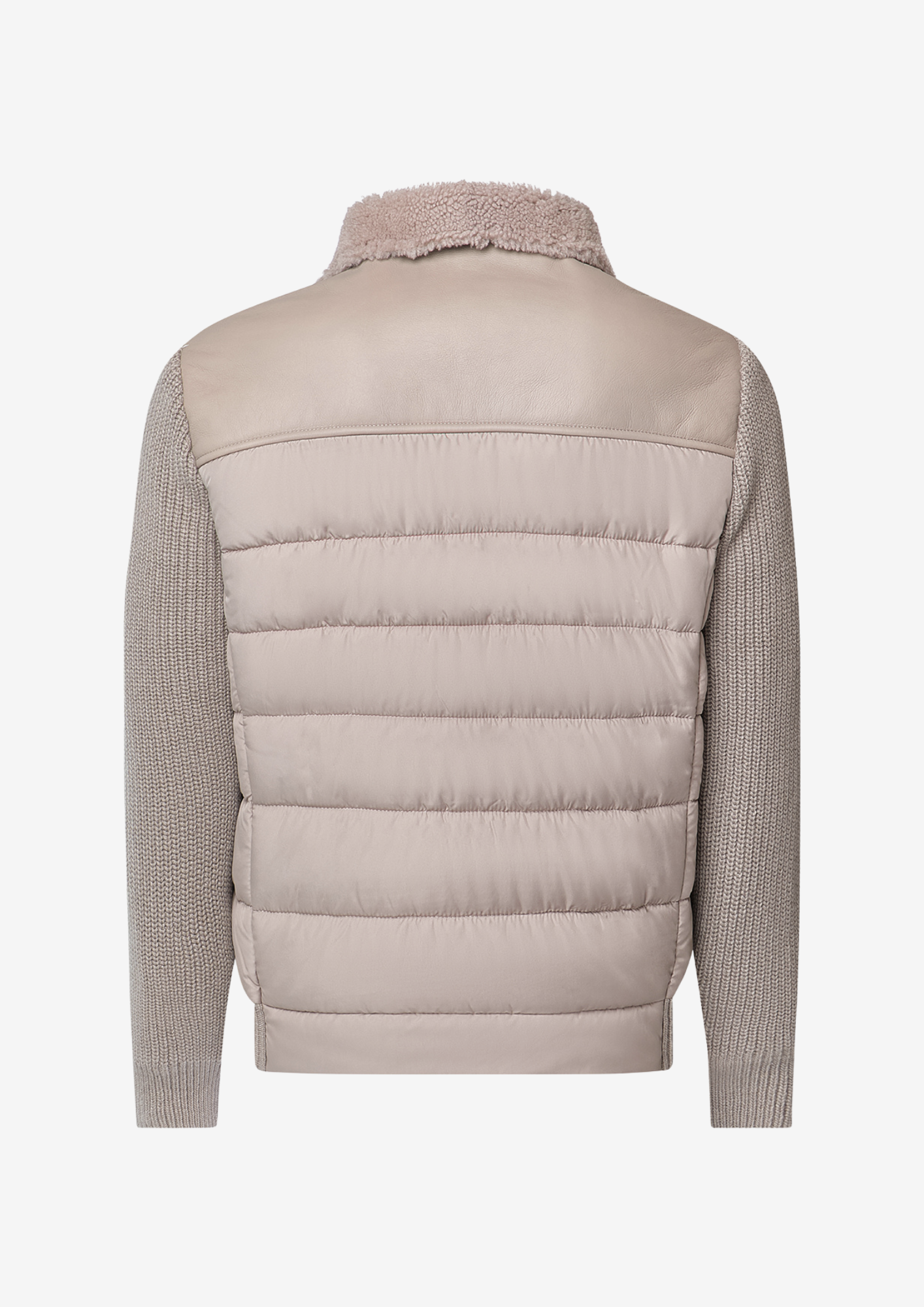 COMPOSITION: LEATHER DETAILS 100% lambskin - FABRIC 100% polyester - LINING 100% polyester - POCKET LINING : 100% cotton - PADDING : 100% polyester - KNIT PARTS 10% cashmere 40% virgin wool 30% viscose 14% polyamide - 6% elastane
