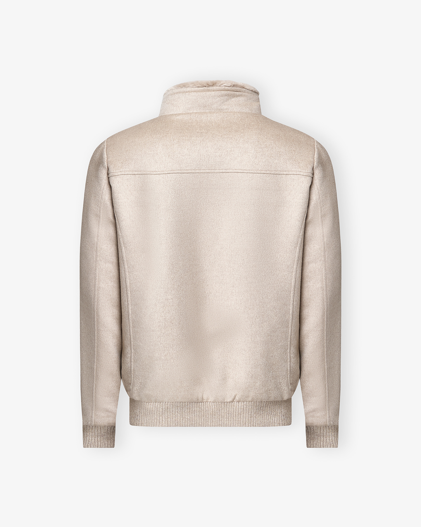 Smooth blouson lined and filled with goose down, internally quilted with boudin of a material of Excellence: rare and precious baby cashmere, extremely soft and finer than traditional cashmere. Obtained by combing the fleece of the kids of the white Hircus goat from the desert area between Mongolia and northern China. Each kid produces only 30 grams of fiber, making this material very limited.